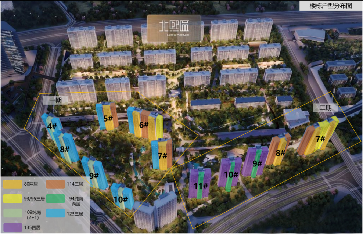 规划12栋住宅楼,北排6栋为18F小高层,南排为10F/11F洋房,总计1358户,面积段72-136㎡。